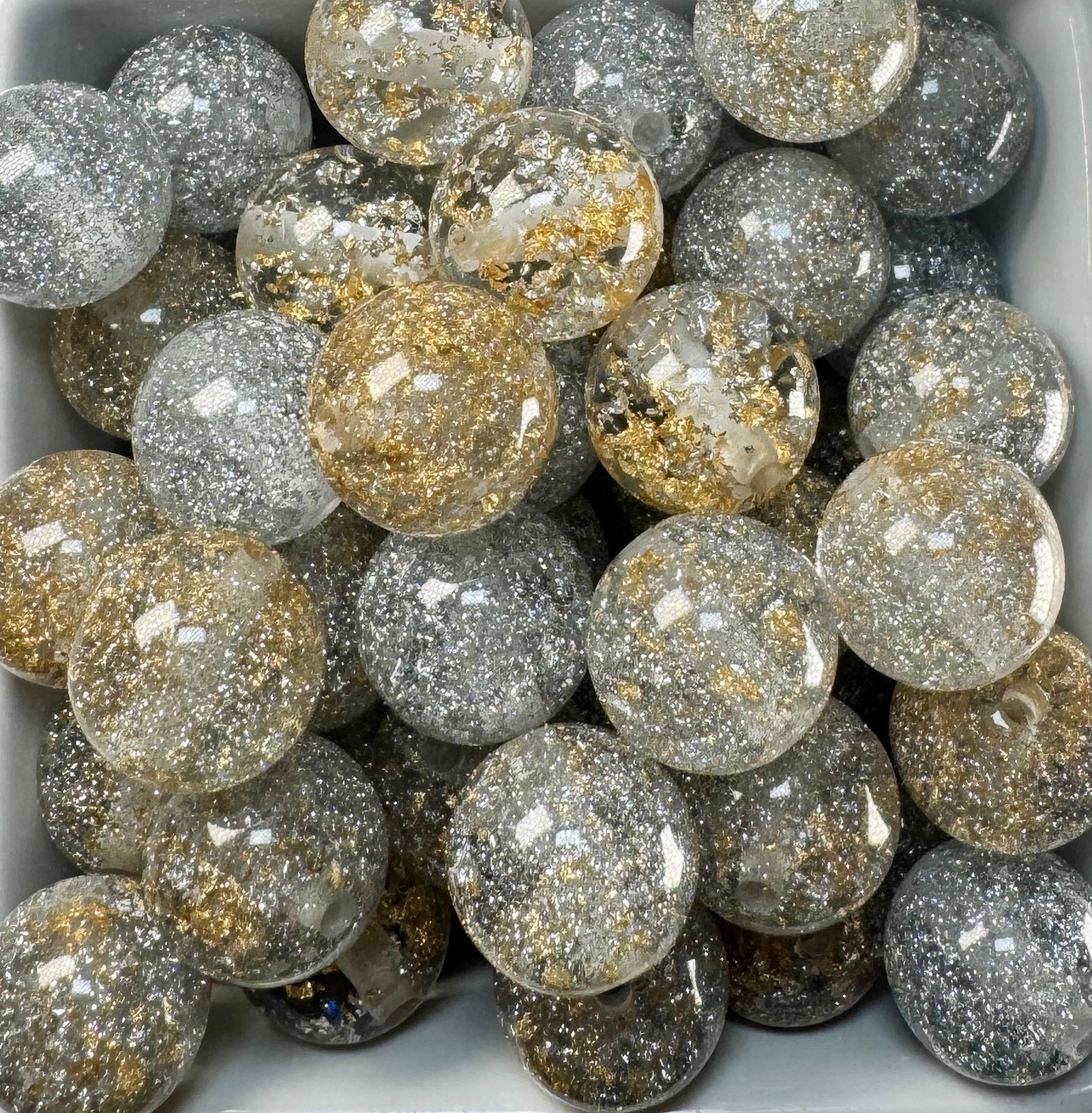 ⭐ Details: • Material: Resin/acrylic with metallic foil and glitter accents • Design: Clear bead infused with sparkling silver and golden foil • Size: Standard bead size (fits most beadable pens, keychains, and jewelry designs) • Features: Lightweight, durable, and elegant with a metallic glow