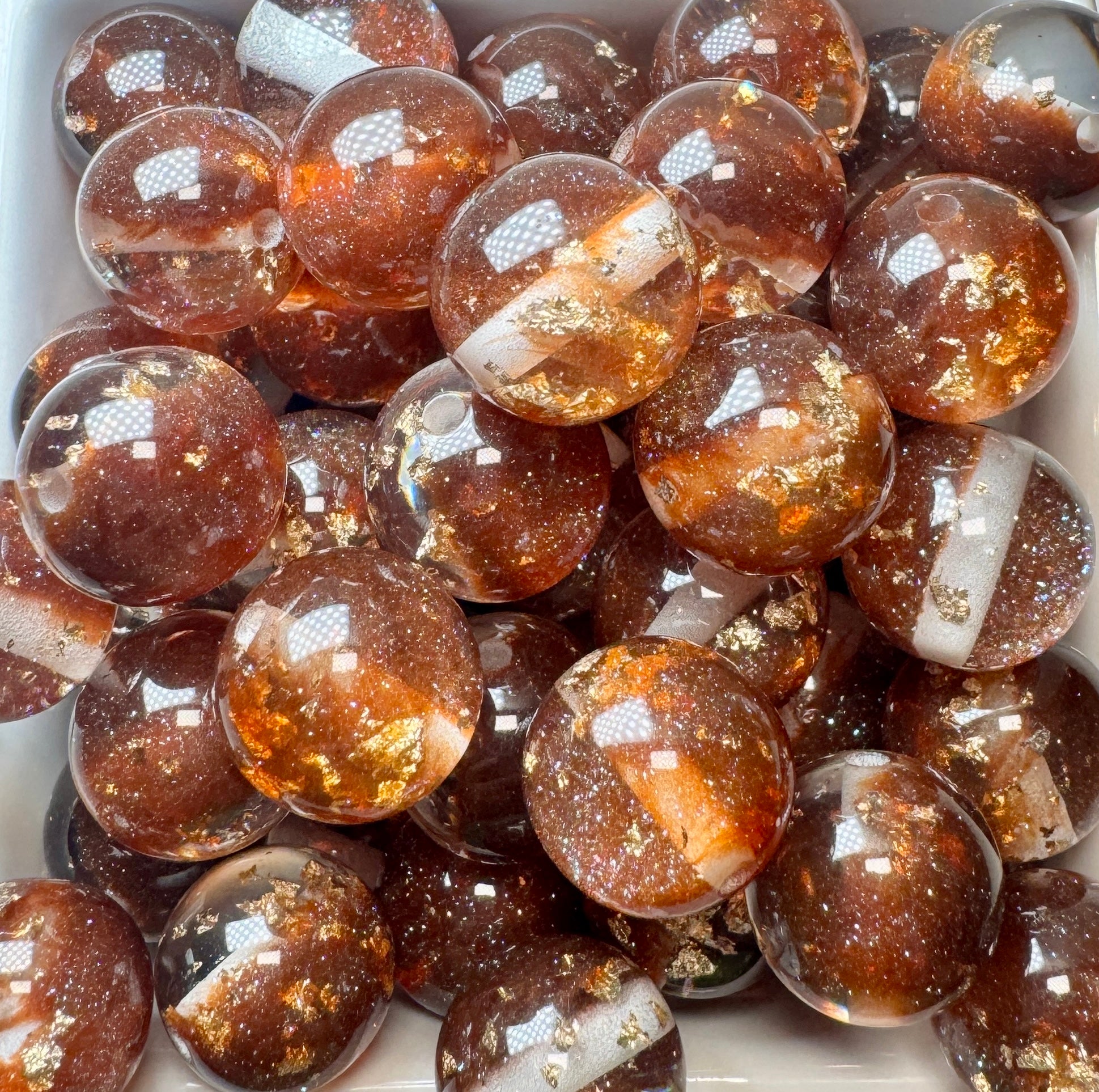 ⭐ Details: • Material: Resin/acrylic blend with glitter and metallic foil • Design: Warm mocha tones swirled with golden flakes and shimmer • Size: Standard bead size (fits most beadable pens, keychains, and jewelry designs) • Features: Lightweight, durable, and glowing with cozy coffee-inspired style
