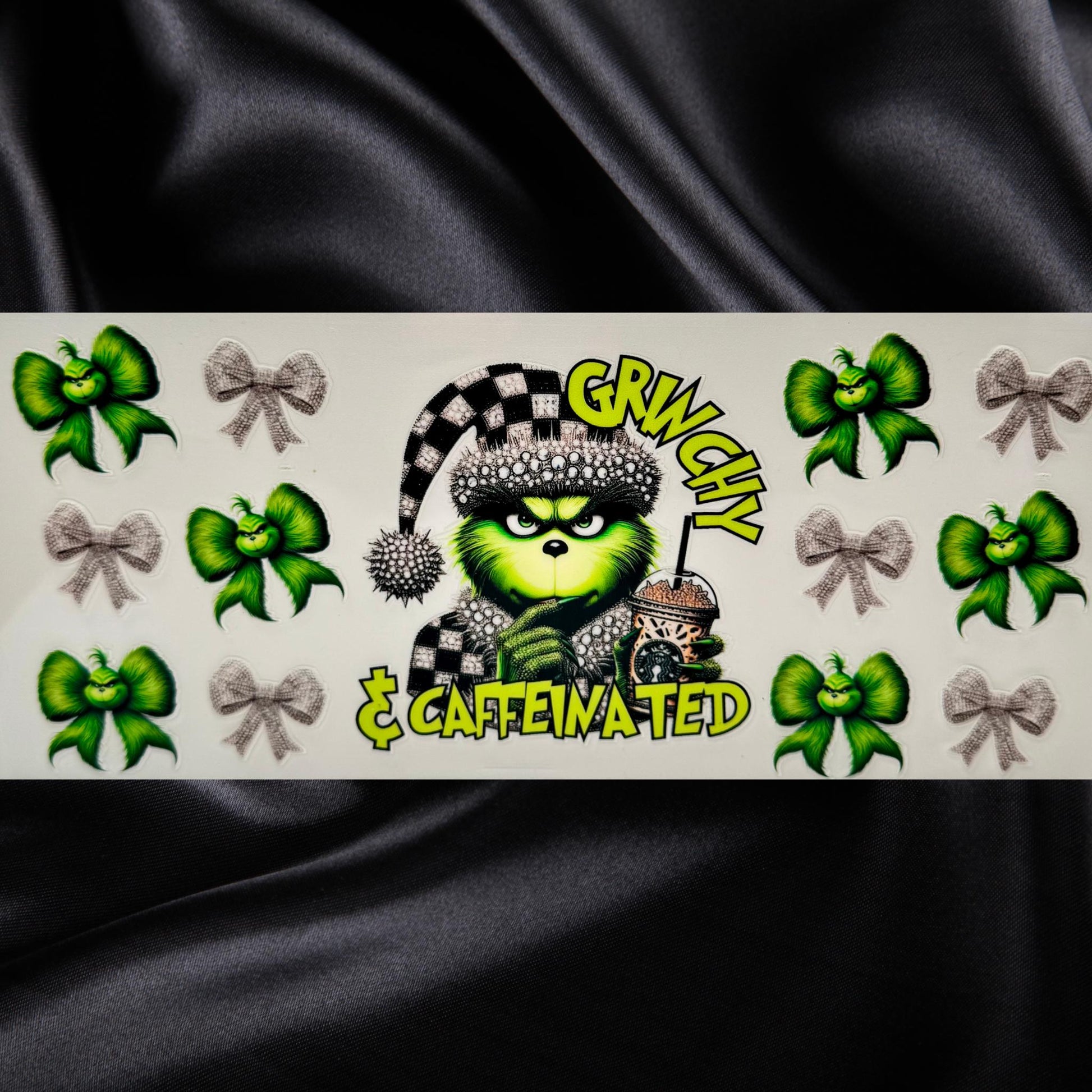 Holiday lovers coffee fans and gifting. A grumpy yet festive character with bows and caffeine in hand perfect for sassy Christmas sips!