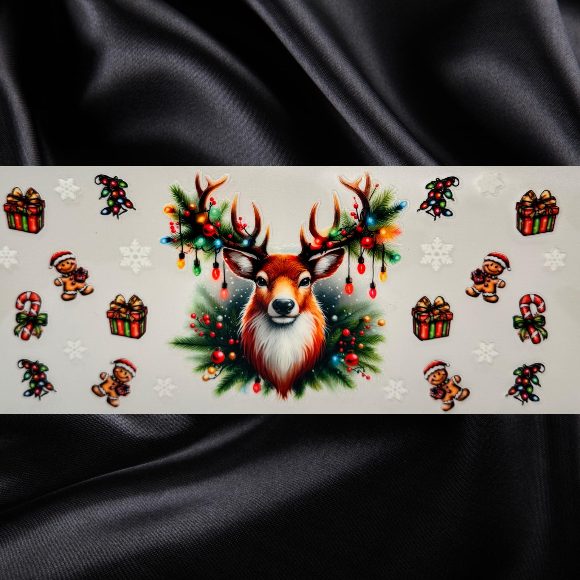 Hunters holiday lovers and gift giving. Celebrate Christmas with a festive deer wrapped in lights gingerbread cookies and presents for the perfect seasonal sip!