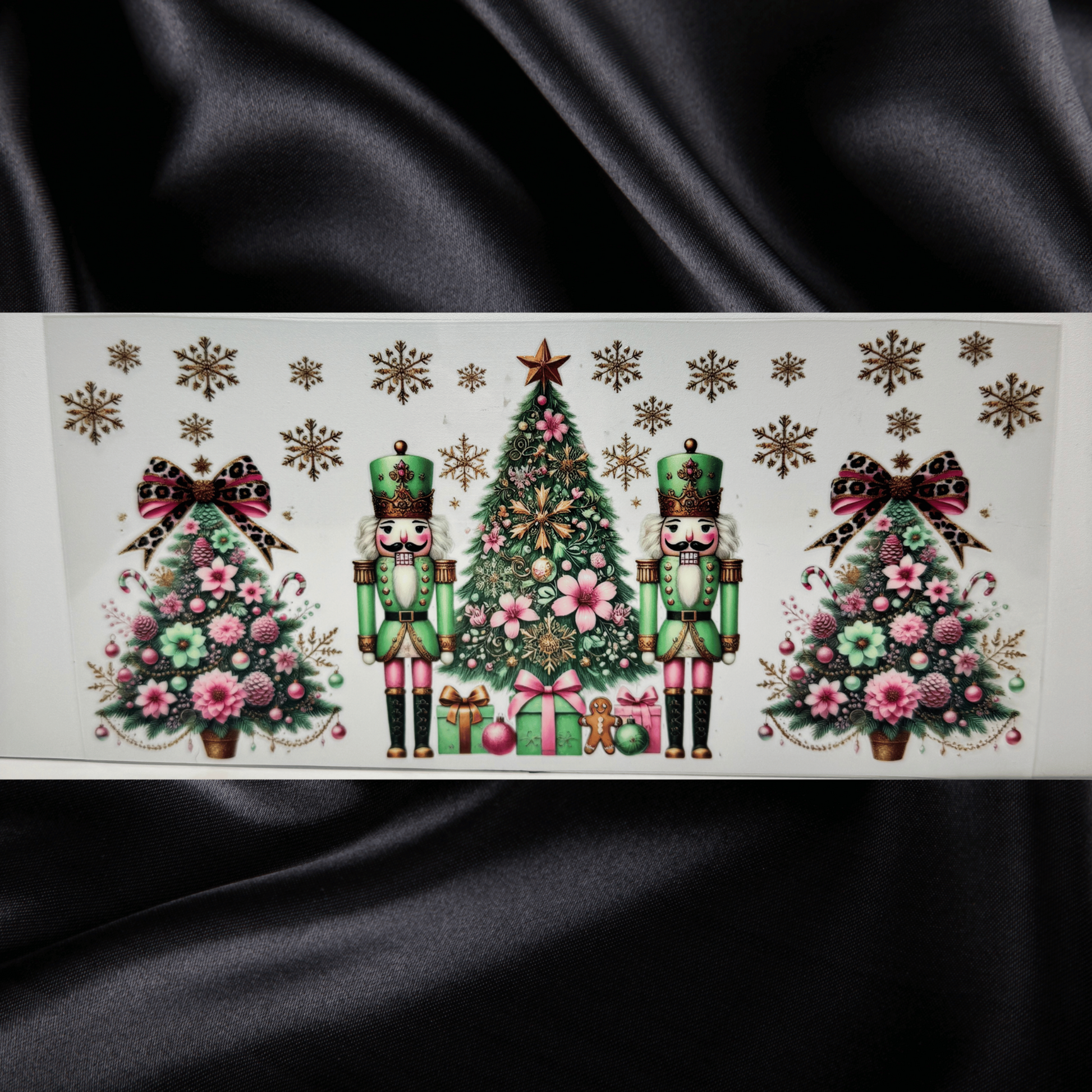 ⭐ Details: • Premium UVDTF cup wrap, durable, waterproof, and scratch-resistant • Designed to fit 16oz Libbey glass cans • Features nutcracker soldiers, glittering Christmas trees, bows, gifts, and snowflakes in pink, green, and gold accents • No sealing required, just peel, press, and smooth on • Fade-resistant colors for a magical holiday look