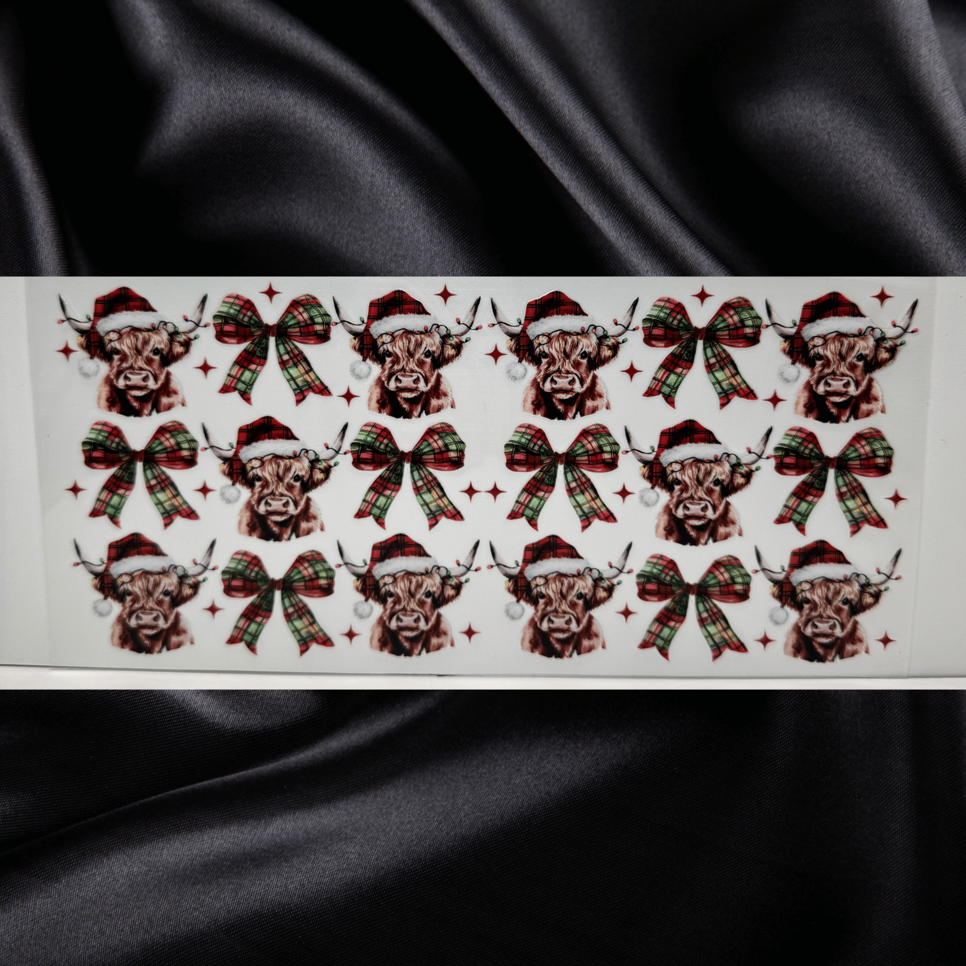 ⭐ Details: • Premium UVDTF cup wrap, durable, waterproof, and scratch-resistant • Designed to fit 16oz Libbey glass cans • Features festive Highland cows wearing Santa hats, paired with plaid holiday bows and star accents • No sealing required, just peel, press, and smooth on • Fade-resistant colors for long-lasting seasonal fun